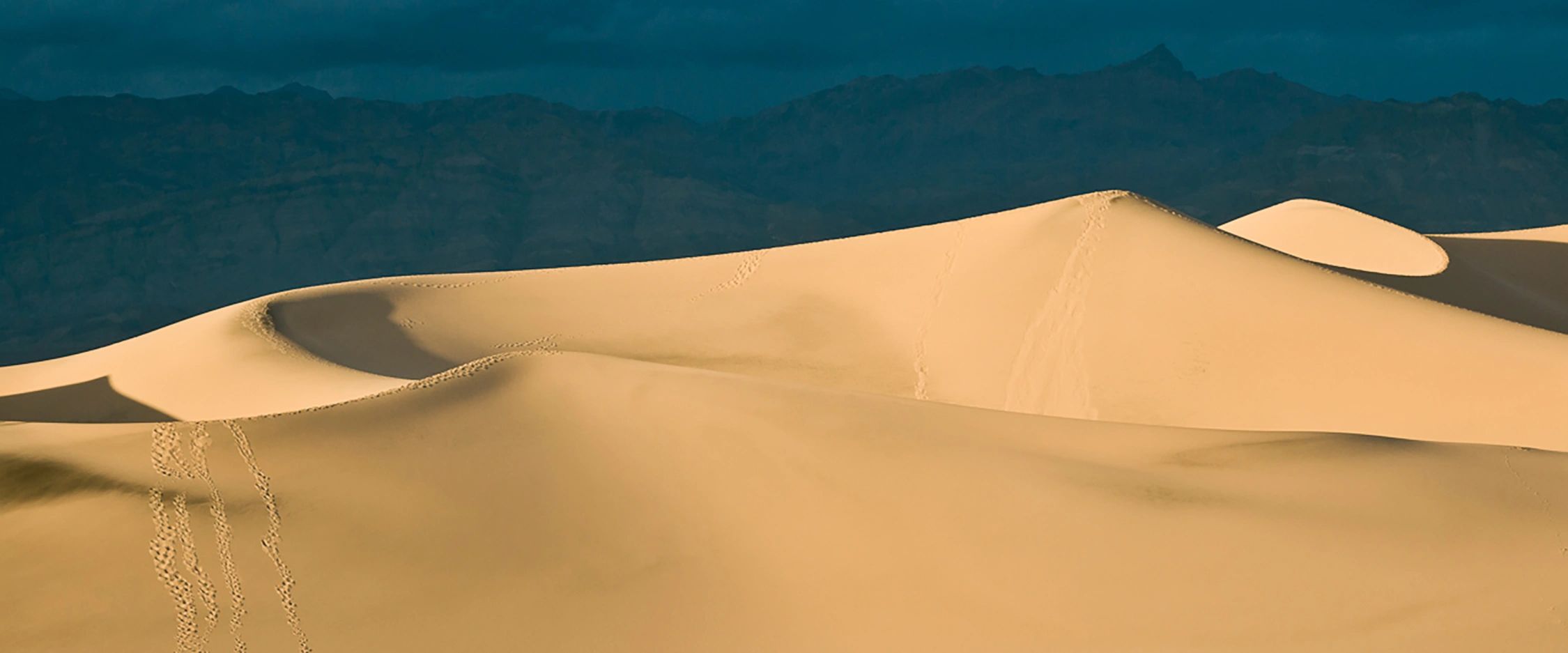 “Mesquite Flat Dunes” highlights the beautiful natural curves of a dune field in Death Valley near sunset, providing a softer echo of the jagged mountain forms in the distance. Some people explored these dunes earlier in the day, but all that is left now is their footsteps.