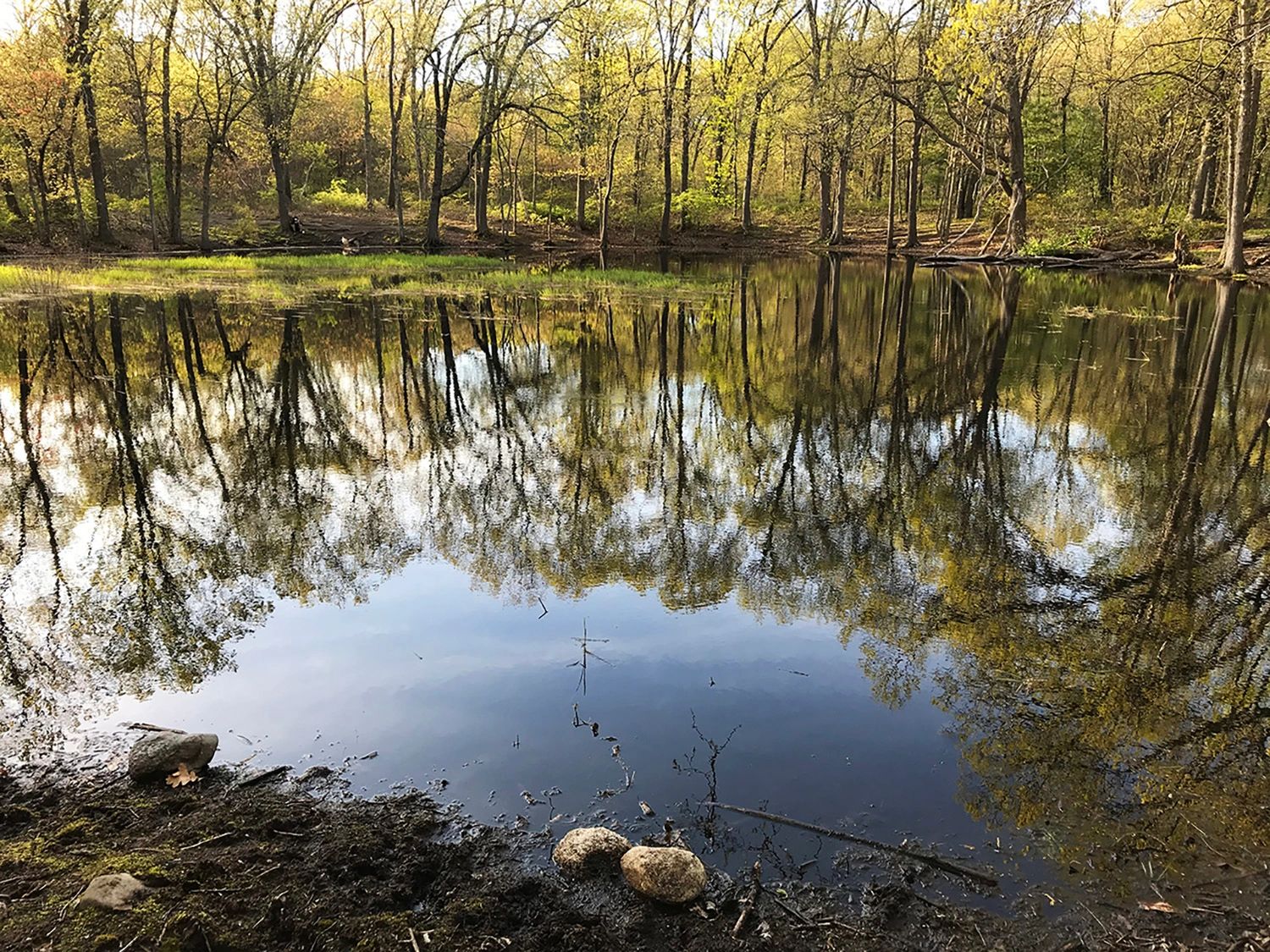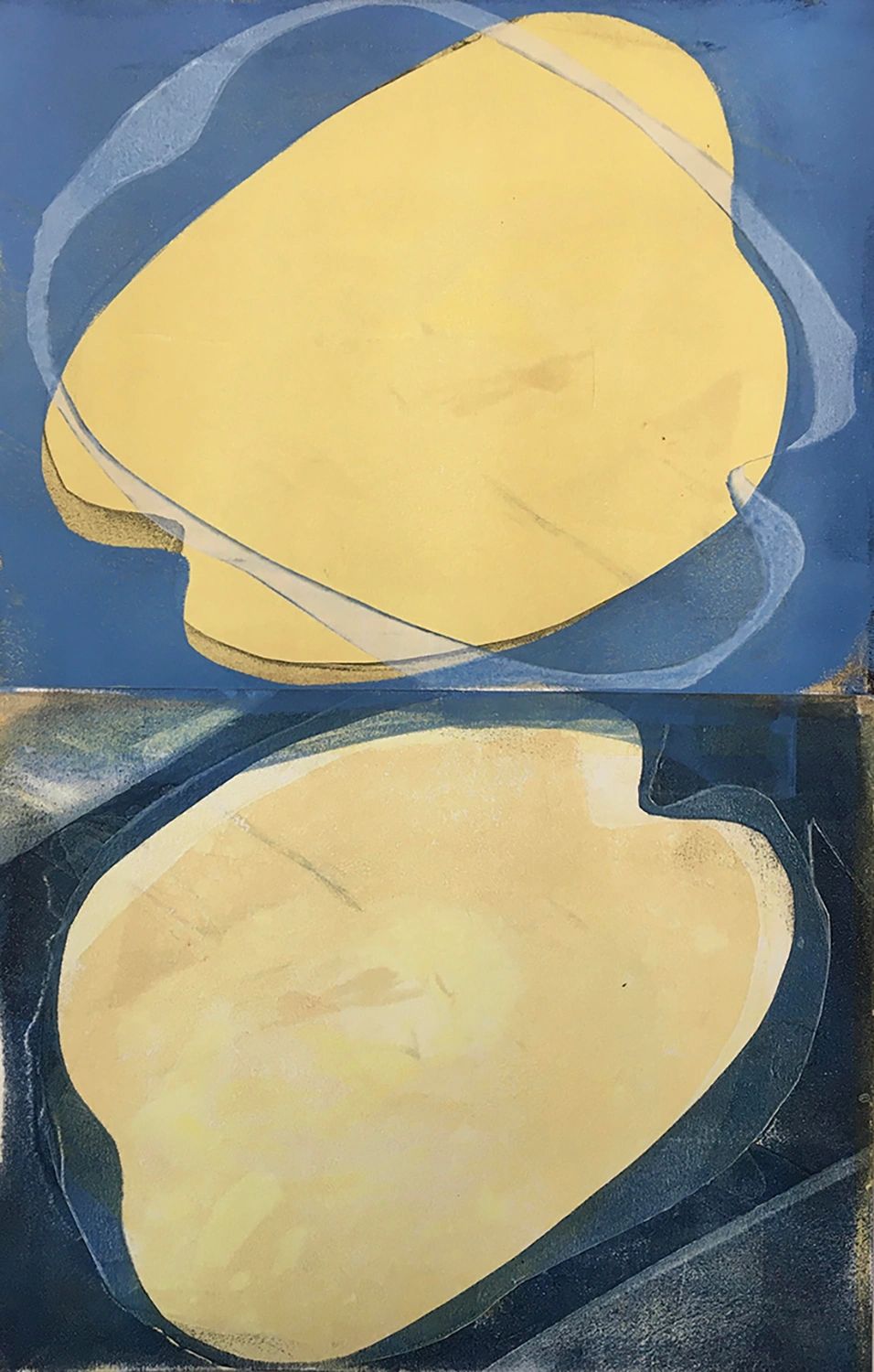 The three monoprints I am submitting for consideration were inspired by daily walks around a local reservoir throughout the seasons. During the past year these walks helped sustain me. The colors, shapes and lines I noticed everyday took on new meaning and provided new inspiration in my art making. While challenging days of remote work and homeschooling blended into each other and the impact of the pandemic around the world brought fresh horrors each morning, the dirt path I followed with my dog each day was reassuringly constant yet always slightly different. Each turn around the reservoir brought a new variation from the day before: a quiet power in the shape of the rock that I passed everyday; delicate lines in the layers of recently formed ice; surprising textures in the patterns of a fallen leaf. The natural world continued its work- it had seen plagues before. This thought was simultaneously comforting, astonishing and disconcerting. I sought to convey this sense of awe, reverence and succor in my art making- in the shapes, lines and colors inspired by those I saw on my walks. In layers of muted or saturated colors I tried to communicate the solace of understanding that these ordinary rocks, water and trees were so much grander than they seemed, so much more meaningful than prosaic landmarks passed in my quotidian routine. The process of attempting to communicate these ideas and feelings in my printmaking echo the peace and wonder I experience in nature. I hope that the artwork offers some sort of respite and joy to the viewer as well.